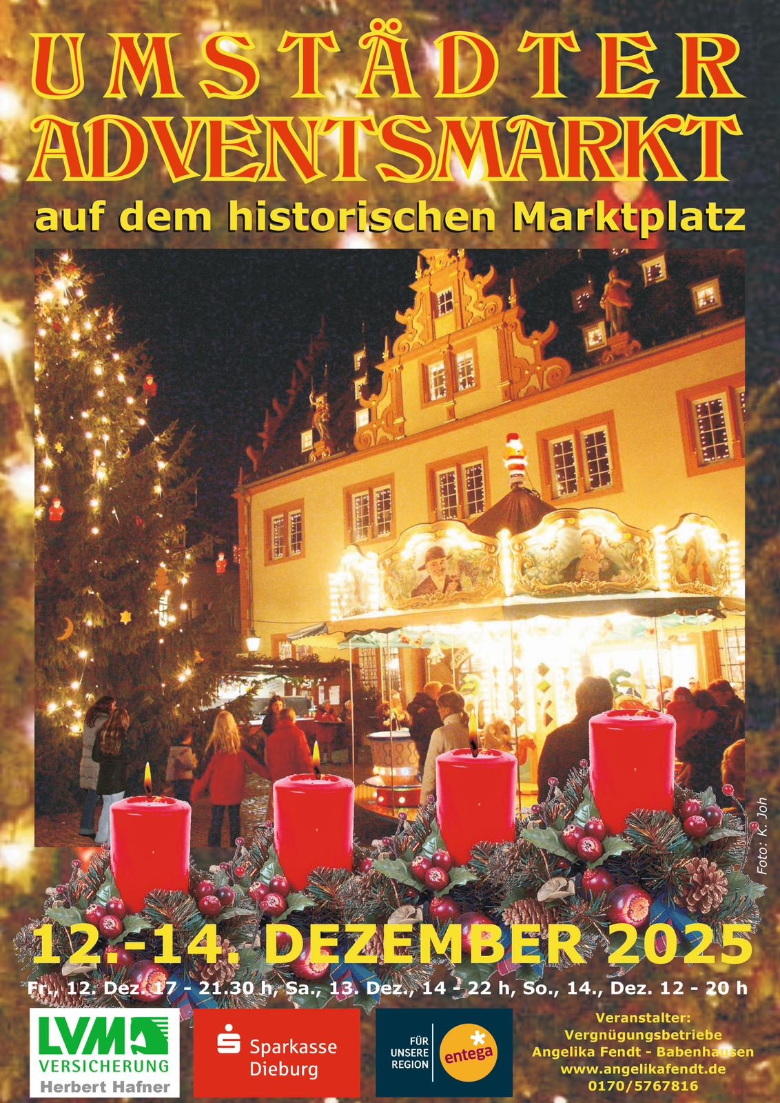 Vom Freitag, 12. Dezember, bis Sonntag, 14. Dezember 2025, lädt die Stadt Groß-Umstadt wieder herzlich zum traditionellen und stimmungsvollen Adventsmarkt auf dem historischen Marktplatz ein. Besucherinnen und Besucher dürfen sich auf ein liebevoll gestaltetes Ambiente, ein abwechslungsreiches Bühnenprogramm sowie zahlreiche kulinarische und kreative Angebote freuen. Die feierliche Eröffnung nimmt Bürgermeister René Kirch am Freitag um 17:00 Uhr vor.