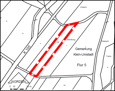 Das Flurstück Gemarkung Klein-Umstadt, Flur 5, Flurstück 10 liegt ca. 520 m südöstlich der bebauten Ortslage von Klein-Umstadt in der Gewann „Hinterm Hardberg“ östlich der Kreisstraße K 105.
