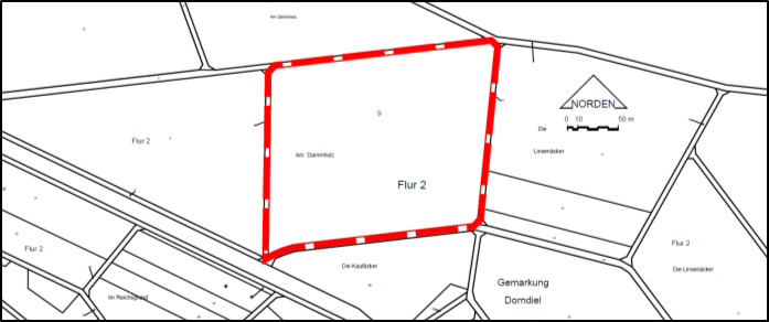 Das Flurstück Gemarkung Dorndiel, Flur 2, Flurstück 9 liegt ca. 150 nördlich der bebauten Ortslage von Dorndiel in der Gewann „Am Dammholz“ nordöstlich der Landesstraße L 3413.