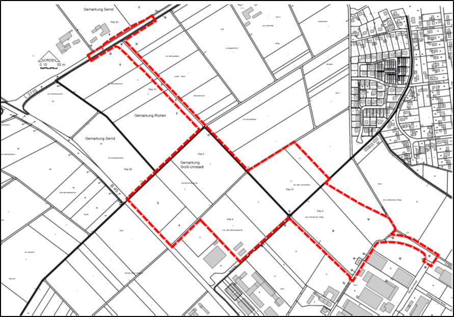 Das Flurstück Gemarkung Semd, Flur 10, Flurstück 11 erstreckt sich ca. 60 m südlich der Abfahrt der B 26 auf die B 45.