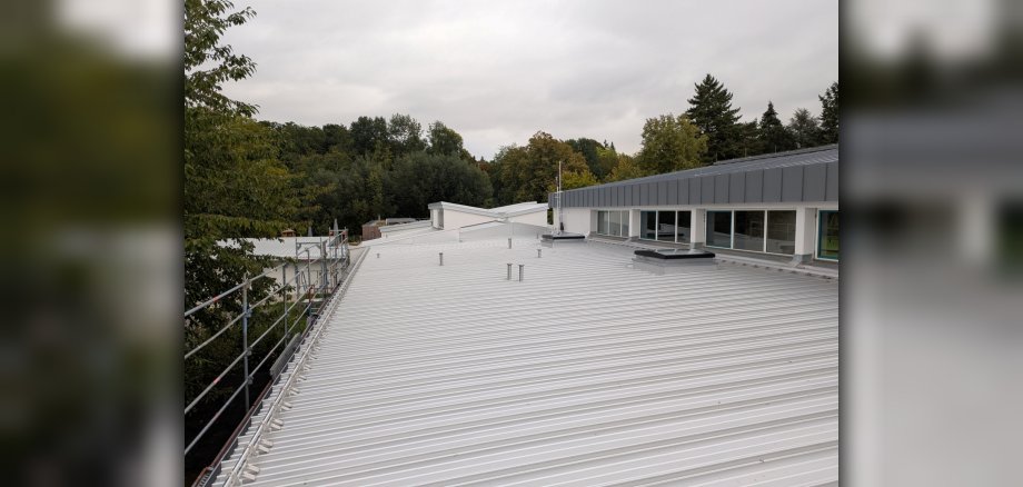 Während die bestehende Dachtragkonstruktion der Kita unangetastet blieb, wurde die alte Zinkfalzdeckung entfernt und durch eine neue Aluminiumfalzblech-Dachhaut ersetzt – entsprechend der Ausführung an der Bürgerhalle. Diese langlebige Lösung reduziert den Wartungsaufwand und schützt künftig noch zuverlässiger vor eindringender Feuchtigkeit.
