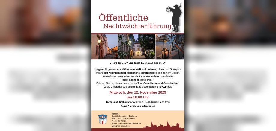 Am Mittwoch, den 12. November 2025, lädt die Stadt Groß-Umstadt zu einer besonderen historischen Führung ein. Um 18:00 Uhr geht es mit dem Nachtwächter Hans-Peter Waldkirch, stilgerecht gewandet mit Gassenspieß, Laterne, Horn und Dreispitz, durch die malerischen Gassen der Altstadt. Mit einem Augenzwinkern erzählt er so manche spannende Anekdote aus seinem damaligen Berufsalltag. Denn als Nachtwächter kannte er die Bewohner der Stadt und wusste oft besser als manch anderer, was hinter den Häuserfassaden geschah. Die Nachtwächterführung bietet Teilnehmenden die Gelegenheit, Geschichte und Geschichten Groß-Umstadts aus einem ganz besonderen Blickwinkel zu erleben.